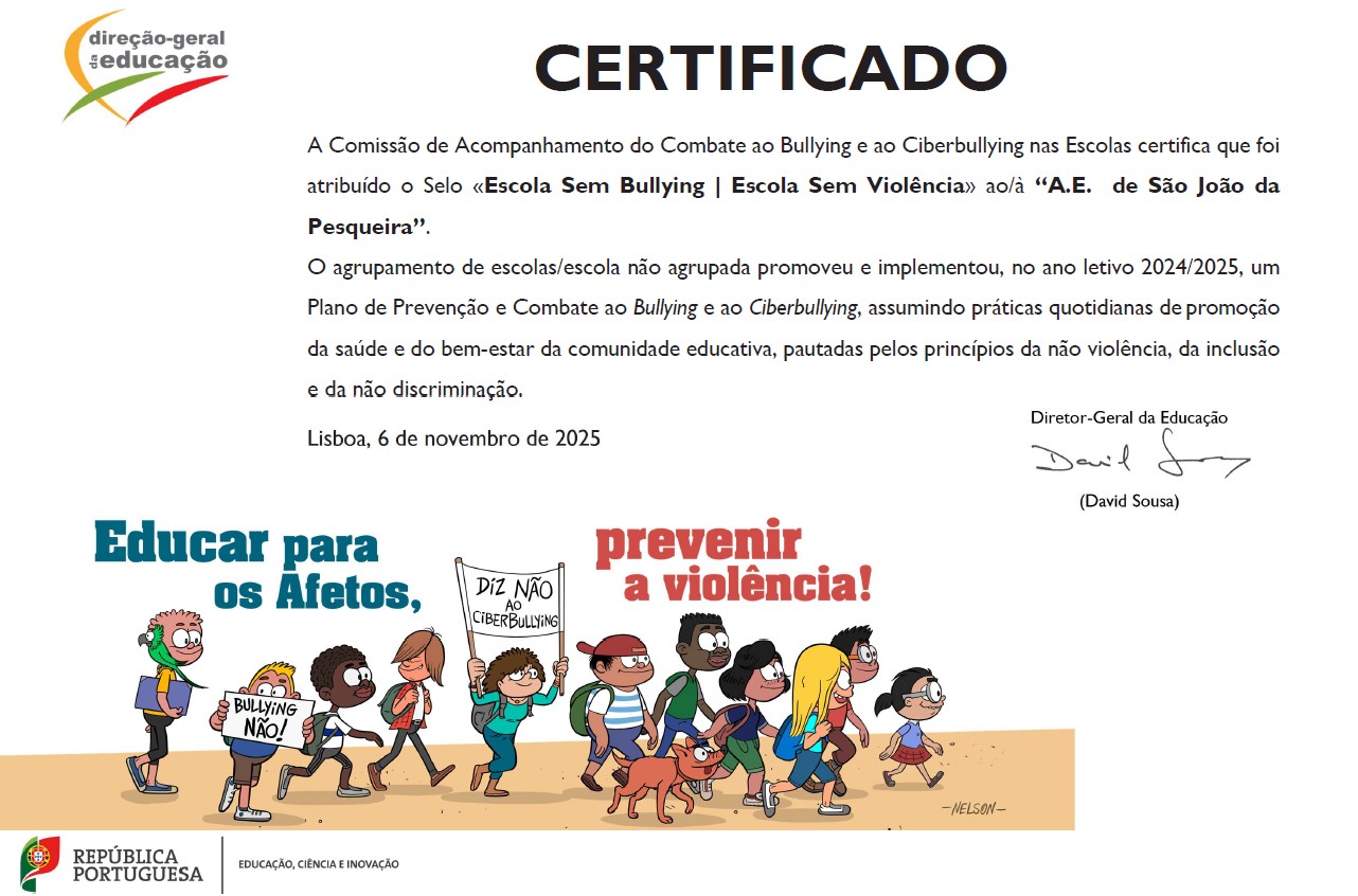 O Agrupamento Escolas de São João da Pesqueira é um dos distinguidos com o selo “Escola Sem Bullying | Escola Sem Violência”, por ter promovido e implementado, no ano letivo 2024/2025, um Plano de Prevenção e Combate ao Bullying e ao Ciberbullying.