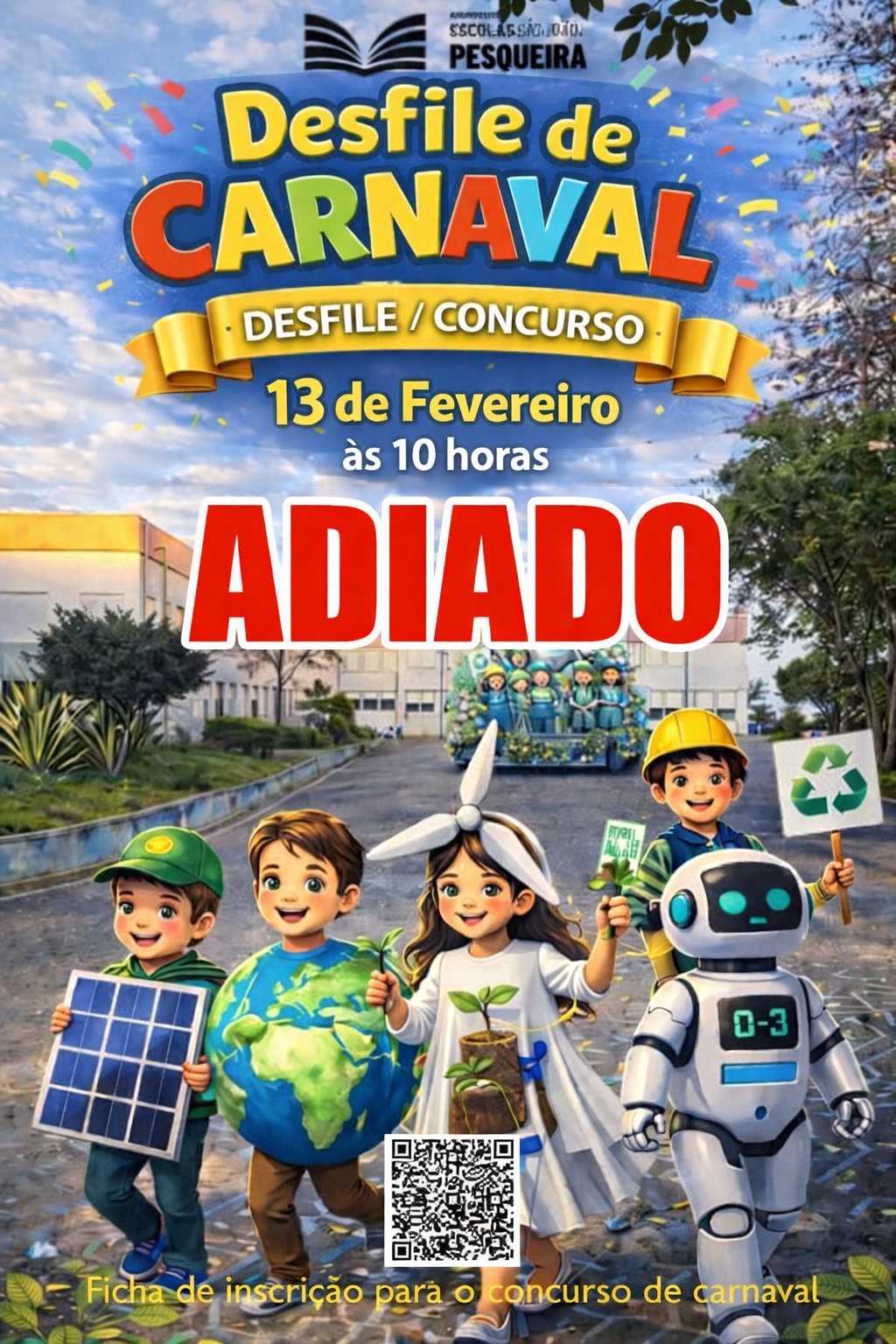 Devido às previsões meteorológicas adversas para esta semana, o Desfile de Carnaval Escolar com a temática “Clima, Sustentabilidade e Tecnologia”, marcado para a próxima sexta-feira, dia 13 de fevereiro, não se realizará.