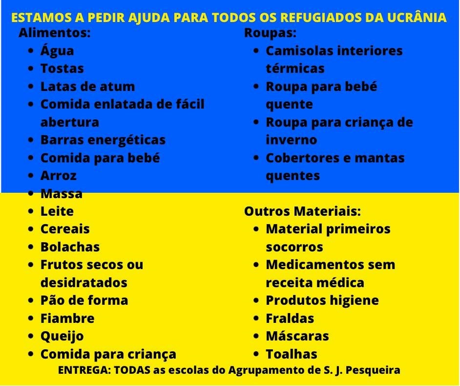 Precisamos de ação rápida e por isso a partir de amanhã até quinta-feira, dia 3 de março, estará a decorrer uma campanha de recolha de bens essenciais, que pode ser entregue em todas as escolas do Agrupamento.
