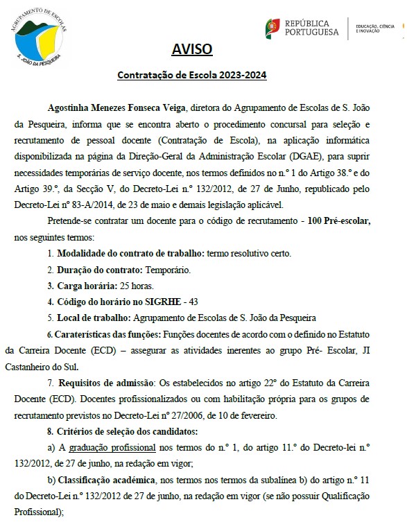 Torna-se público o Aviso de contratação de escola do grupo disciplinar 100 - Educação Pré-escolar