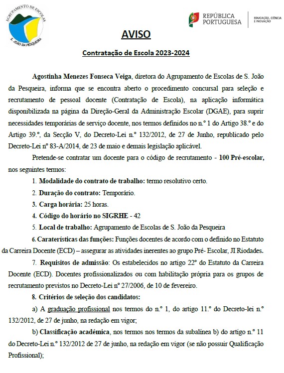 Torna-se público o Aviso de contratação de escola do grupo disciplinar 100 - Educação Pré-escolar