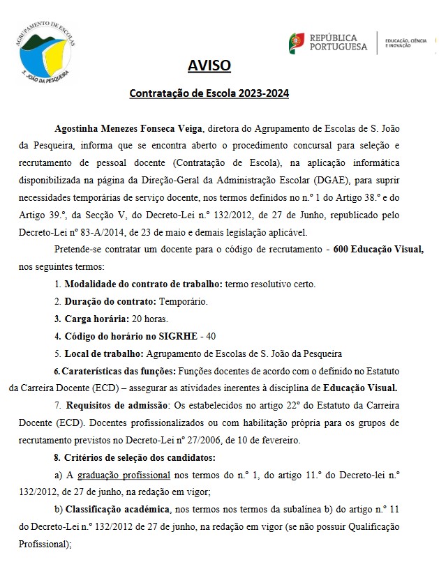 Torna-se público o Aviso de contratação de escola do grupo disciplinar 600 - Educação Visual